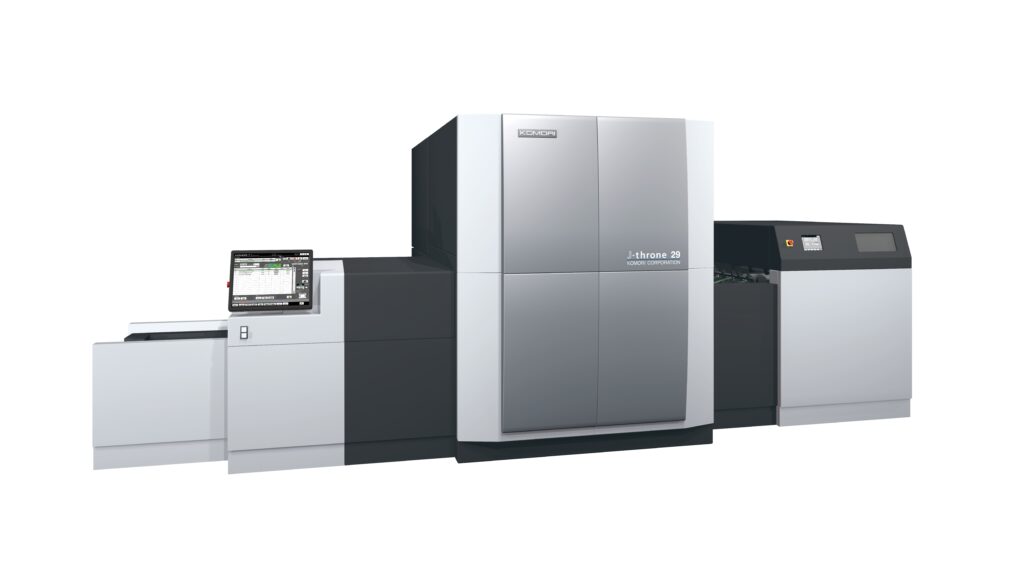 「J―throne 29」は、KOMORIが長年にわたり培ってきたオフセット印刷の技術と、最新のUVインクジェット技術を融合させたB2枚葉UVインクジェットデジタル印刷機。